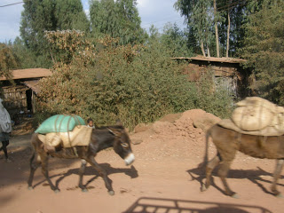 Jedziemy do centrum, taksówka ledwo trzyma się kupy, to pewnie 30 letnia Łada, która doskonale pamięta czasy dyktatury Mengistu. Pierwsze chwile są ciekawe. Zapach powietrza jest dla mnie mieszanką Maroka i Indii. Jest jednak znacznie chłodniej, wręcz zimno. Addis jest położone powyżej 2000 m.n.p.m. Ulice nie wyglądają tak źle jak się tego spodziewałem, kilka wysokich budynków, trochę neonów i zupełna pustka o tej porze. Im dalej od lotniska tym ciemniej i bardziej slumsowato. Dojeżdżamy do okolic dworca kolejowego La Garze skąd spodziewamy się złapać autobus do Bihar Daru, tzw. Selam Bus. W dziwnym ciemnym zagajniku czeka grupka ludzi poobwijanych szmatami i łypiących na nas białymi oczami jedynie widocznymi w ciemności. Szybko okazuje się, że na ten kurs nie ma już miejsc a następny jest dopiero jutro. Próbowaliśmy zrobić rezerwację przez Internet jeszcze przed wyjazdem ale bez płatności nie ma takiej możliwości, z drugiej strony nie byłoopcji zapłacenia kartą więc pozostało nam przyjechać „na żywioł”. No ale nic, trzeba kombinować dalej. Łapiemy kolejną taxi, która za 50B zawozi nas na nieodległy plac, z którego odjeżdżają autobusy fimy Sky Bus. I znowu to samo… nie ma już miejsc. Ludzie polecają nam jednak zaczekać gdyż zdarza się, że ktoś nie przychodzi i miejsce się zwalnia. I tak się właśnie dzieje! Znajdują się 2 miejsca w autobusie do Gonder, który jedzie przez Bihar Dar. Siadamy na samym końcu w autobusie pełnym czarnych głów i odpadamy szybko w sen zaraz za rogatkami Addis, które kończą się nie wiedzieć kiedy. Gdy wstaje dzień dostrzegam za oknem krajobraz, który można by nazwać podobnie jak ktoś to uczynił w innej relacji z Etiopii – „Mazowsze we wrześniu”.  Trudno uwierzyć, że taki szmat drogi a różnice niewielkie. Gdy jednak skupić się na szczegółach, widać, że tak nie jest. W autobusie jedzie się dobrze, droga jest asfaltowa do samego Bihar Daru. Jesteśmy pełni optymizmu co do stanu dróg nie mając świadomości co nas jeszcze czeka i jak bardzo wpływa to na przebieg podróży.