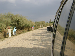 Dowiadujemy się w hotelu, że jeszcze dziś mamy okazję pojechać nas wodospady Tis Ysad na Nilu, co by nam fajnie przyspieszyło plan. I tak po 1,5 doby w podróży mam 5 minut na prysznic i w drogę. Małym busem spod hotelu wyjeżdżamy razem z grupką Hiszpanów. Wjeżdżamy do centrum Bihar Daru i do bocznych uliczek wcześniej nie widzianych z perspektywy drogi krajowej. Dopiero tu odsłania nam się kawałek Afryki jakiej się spodziewaliśmy. Prymitywne domy, rynsztoki, krowy i owce biegające po suchym klepisku, obszarpani i bosi ludzie dźwigający niewyobrażalnie wielkie pakunki, kobiety z bukłakami wody na głowach i wszędobylskie umorusane dzieci z wielkimi czarnymi oczami. Nie trudno nie dostrzec też organizacji i tempa pracy Afrykańczyków, którzy wiecznie na coś czekają, żaden proces nie jest u nich płynny, wciąż się zawiesza, bo to na ktoś nie zapłacić, bo kierowca wyskoczył do sklepu, bo milion innych powodów. Tu się po prostu czeka. Jest godzina 16 i stoimy, słońce zajdzie około 19 więc grupka zaczyna się burzyć. To nasza pierwsza lekcja, że w Etiopii zawsze trzeba kogoś trochę „kopnąć” by się ruszył.  W końcu ruszamy i przez 1h jedziemy kamienistą drogą po niemiłosiernych wybojach.
