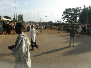 Po szybkim posiłku – warzywa, ryż i omlet- zamawiamy w recepcji minibus za 78 B, który podjeżdża niedaleko przy drodze głównej. Żegnamy Bihar Dar siedząc z tyłu vana i obserwując za oknem fascynującą prostotę afrykańskiego życia. Po kilu przystankach mini van zapełnia się po brzegi a miejsce na nadkolu, gdzie początkowo mogłem rozprostować nogi, okazuje się regularnym siedziskiem. Jedziemy w mega ścisku, zaduchu i oparach murzyńskiego potu. Jest strasznie niewygodnie a droga zamiast planowanych 3 trwa ponad 4 godziny. Próbuję słuchać muzyki ale nieznośne amharskie dźwięki z głośników kierowcy zagłuszają moją, mimo słuchawek wciśniętych do połowy czaszki. Policja zatrzymuje nas po drodze 2 razy, za drugim okazuje się, że nasz kierowca…nie ma prawa jazdy. Ale oczywiście po otrzymaniu mandatu wsiada za kierownice i jedzie dalej. Nie pytam dlaczego. Obserwuje i coraz mniej mnie dziwi każdy kolejny absurd.