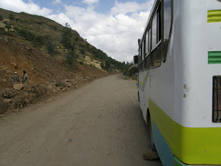 Idziemy dalej, mijamy rikszarzy i taksówkarzy odmawiając podwiezienia, upał zaczyna doskwierać. Szybko gubimy drogę, ale pytamy się co niektórych lepiej ubranych ( wszyscy inni wołają kasę nawet za wskazanie drogi). Przypadkowo natrafiamy na faceta, który ofertuje nam trekking w górach Simien za 13000 B ( ok. 800 $). Początkowo dopytujemy z zaciekawieniem o szczegóły ale tylko do czasu gdy orientujemy się, że nam się zera pomyliły, gdyż planujemy to samo za dziesięciokrotnie niższa sumę. Ruszamy dalej, każdy kolejny człowiek pokazuje nam inna drogę. Irytacja rośnie razem z upałem i w końcu odpuszczamy sobie wracając tuk tukiem do hotelu. Chcemy jeszcze dziś zebrać się do Debrak więc przyspieszamy. W hotelu szybki posiłek i w drogę. Do dworca jest kilkaset metrów więc dochodzimy tam na piechotę. Szybko odnajdujemy autobus, który oczywiście jest pełny ale za chwilę znajdują się dwa wolne miejsca po 50 B od głowy. Kierowcy bardziej opłaca się wziąć 2 białasów i skasować nas więcej, dziwi jedynie to, że nikt się nie buntuje z takiego obrotu sprawy. Być może trzymają rezerwowe miejsca na takie sytuacje, żeby dorobić. W autobusie poznajemy 2 Węgrów: Ors i Csaba, siedzą obok nas, również wybierają się na trekking w Simien więc szybko łapiemy kontakt. Droga do Debrak znacznie różni się od poprzednich, w Gonder skończył się asfalt i nie prędko go znów zobaczymy. Zaczyna się coś co odróżnia podróżowanie po Afryce od przejazdów po Azji południowo – wschodniej lub Indiach. Jedziemy po kamieniach, dlatego odległość 200 km pokonujemy w 5 h z licznymi przerwami na naprawianie kół.
