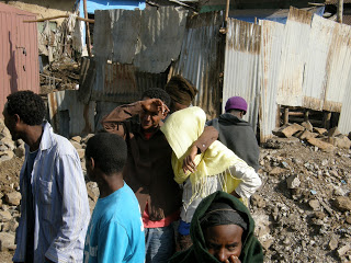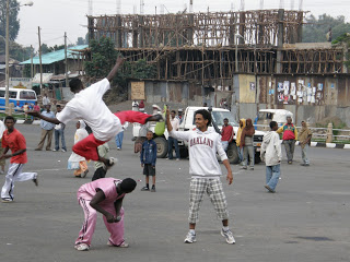 Rano bez śniadania uderzamy od razu rozejrzeć się po mieście. Trzeba przejść przez slumsy żeby dojść do głównej drogi. Jeszcze nie jesteśmy wprawieni i wydaje nam się, że to slumsy, a to po prostu normalka tutejsza. Brudnawe dzieci grają w piłkę a kobiety gotują na ogniskach przed domami. Domy są murowane, niektóre czarne od sadzy, inne jaskrawo niebieskie. Początkowy odruch mam taki, że nie bardzo chce mi się cykać zdjęcia kiedy taka bieda dookoła. Gdy jednak zapuszczę wzrok w boczne uliczki widzę, że tam jest jeszcze gorzej. Prawie wszystkie dzieci zaczepiają nas krótkim „hello, salam” po czym szybko przechodzą do sedna sprawy:„one birr”. Robimy rundkę wokół słynnego zamku Gonder i dochodzimy do centralnego placu miasta gdzie w rytm muzyki odbywa się zbiorowa lekcja sztuk walki, ciekawa scenka.