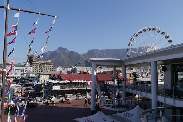 Po zajechaniu na dół utknęliśmy w mega korku w drodze na wybrzeże portowe VA Waterfront. Akurat była godzina szczytu wiec bocznymi uliczkami kombinując udało nam sie uwolnić. Przy Waterfront można zaparkować w jednym z licznych garaży podziemnych skąd w kilka minut znajdziemy się na głównym deptaku nadbrzeża w Cape Town. Panuje tu komercyjna atmosfera. Restauracje z widokiem na marinę, wielkie centrum handlowe w środku, sklepy z pamiątkami, diabelski młyn i grający muzycy. Wykorzystaliśmy ten niedzielny festyn na obiad i pobiegliśmy z Frankem po genialnym placu zabaw, z którego nie chciał zejść.