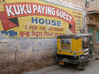 Hotel Shivam Paying Guesthouse coraz bardziej nam się podoba. Okno nie ma krat, w kranie jest ciepła woda, cichy wiatrak przy suficie i pierwsza działająca spłuczka od wc. Po odespaniu ruszamy na miasto. Przez wąskie niebieskie uliczki przeciskają się autoriksze , krowy i ludzie. Zapachy krowiego łajna i rynsztoków po obu stronach uliczek mieszają się z aromatem przypraw i kadzideł. Wokół mnóstwo guesthouse’ów z nieodłączną działającą jak magnez na turystów „Top Roof Restaurant”.