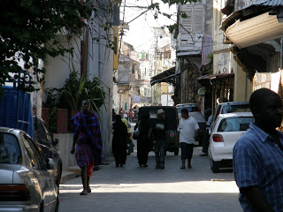 Końcówka wyprawy  nie budzi większych emocji więc zapuszczamy się w kręte i wąskie uliczki Old Town próbując podążać za mapką z Lonely Planet. Szybko się jednak gubimy się , gdyż nie sposób inaczej w tej plątaninie nieoznaczonych dróg. Widać tu wiele meczetów, Mombasa i okolice jest zdecydowanie muzułmańska. Zadziwiają też transparenty słynnych drużyn piłkarskich wywieszone w widocznych miejscach. Widać, że drugą religią są tu rozgrywki Ligii Mistrzów. Na pierwszej głównej ulicy zamieszkują fani Liverpoolu, w uliczce obok dają o sobie znać fani Bayernu Monachium a jeszcze dalej napotykamy entuzjastów FC Barcelony. Zdumiewające jaką siłę ma piłka nożna i jak łatwo pokonała granice. Co drugi mieszkaniec tej planety kibicuje Barcelonie i nie ma w tym już nic dziwnego. Old Town Mombasy nie powala tak jak np. Stone Town na Zanzibarze. Architektura z ciekawymi balkonikami i okiennicami jest niemal niewidoczna spod zwojów kabli i czerni odpadających tynków. Sterty cuchnących śmieci leżą co kilka metrów. Najciekawszy był widok na zatoczkę miasta, pokazał jego różnorodność i urokliwe położenie.