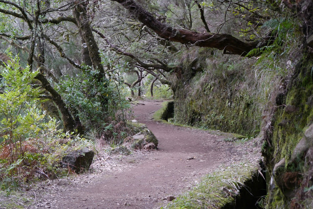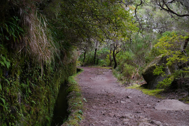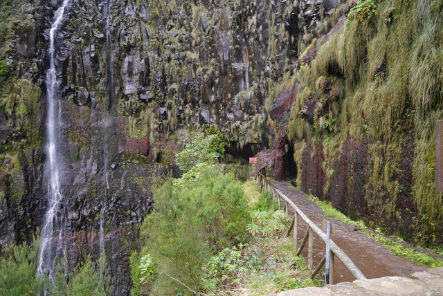 Jadąc dalej trafiamy na parking pod Rabacal. Stąd za 5 EUR w dwie strony busik wozi ludzi do miejsca skąd startują dwie ciekawe lewady Risco i 25 Fontes. Pierwsza z nich jest jedną z najkrótszych na Maderze (1,2 km w jedną stroną) druga niewiele dłuższa ma 2,5 km. Idziemy spacerkiem na Ricso, która kończy się dość wysokim wodospadem. Spacer lewadami jest wygodniejszy niż przeciętny spacer po lesie czy parku w Polsce. Droga jest równa i przygotowana. Roślinność gęsta jak w dżungli a widoki im dalej to coraz ciekawsze. Żal, że nie możemy iść dalej. Przy wodospadzie droga się urywa w tunelu gdzie furtka uniemożliwia przejście na drugą stronę doliny. Woda leci niemal z każdej ściany i już sami nie wiemy czy zaczęło padać czy to woda spadająca ze skał. Powala nas świeżość powietrza i zapach tutejszego lasu szczególnie, że uciekliśmy tu od polskiej zimy, która w naszym mieście zaczyna kojarzyć się z nieznośnym smogiem.