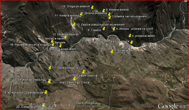 Tym razem zamiast dokładniejszego opisu wykonałem poglądową mapę trekkingu zaznaczając kolejne punkty. Dla zainteresowanych samodzielnym zorganizowaniem podobnego trekkingu mam plik w formacie google earth .kmz ze współrzędnymi poszczególnych punktów. Wystarczy w komentarzu do tego posta dodać swój email to prześlę.
