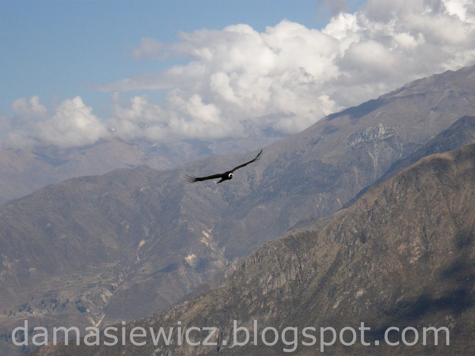 Tak docieramy w miejsce znane jako Cruz del Condor – miejsce obserwacyjne kondorów. Dzieje się rzecz przedziwna. Te wielkie ptaki zdają się być zdalnie sterowane, bo gdy tylko ostatni bus około godziny 9 podjeżdża na parking, i gdy tylko ostatnie 50 osób wysypuje się z aparatami i ustawia w puncie obserwacyjnym – ptaki wylatują i robią kilka pętli nad doliną. Rzeczywiście ptaki to majestatyczne, ich obecność o tej godzinie jest związana ściśle z prawami fizyki, która pozwala  szybować na prądach wznoszących, to jednak cała sytuacja jest jak ustawiony teatrzyk. Gdy zachodzi słońce i ptaków już nie widać, chordy ludzi z aparatami znikają a busiki rozjeżdżają się w różnych kierunkach.