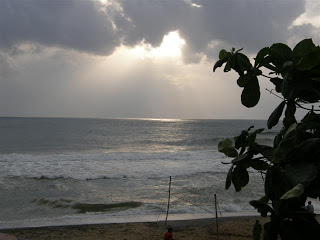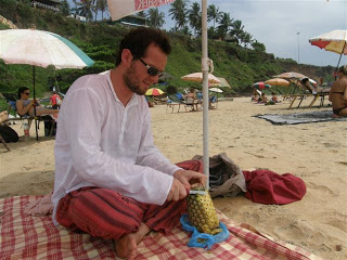 Ostatni dzień w Varkali zaczyna się słonecznie. Wygląda na to, że mamy pogodę w kratkę. Już przy śniadaniu widać jak słońce zmienia ogólną aurę otoczenia. Mimo, że poparzenia słonecznie jeszcze nie przestały doskwierać to po odpowiednim ubraniu się wypożyczeniu parasola lądujemy na plaży. Słoneczny dzień w tym upalnym i wilgotnym klimacie jest trudny do zniesienia, czuje jakby mnie ktoś obkładał gorącą mokrą szmatą. Może i lepiej wyszło z tą pogodą bo mogliśmy trochę odetchnąć. Dziś ocean jeszcze bardziej wzburzony niż wcześniej. Nie odmawiam sobie popływać. Leniwie mija kilka godzin na czytaniu, pływaniu, obieraniu ananasów i obserwacji ludzi dookoła.